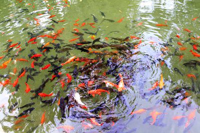 5、红鲤鱼宛如一块块红绸在水面上下舞动。