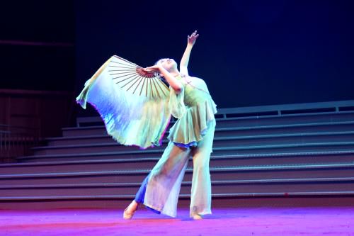 13、清颜白衫,青丝墨染,彩扇飘逸,若仙若灵,水的精灵般仿佛从梦境中走来。天上一轮春月开宫镜,月下的女子时而抬腕低眉,时而轻舒云手,手中扇子合拢握起,似笔走游龙绘丹青,玉袖生风,典雅矫健。乐声清泠于耳畔,手中折扇如妙笔如丝弦,转、甩、开、合、拧、圆、曲,流水行云若龙飞若凤舞。