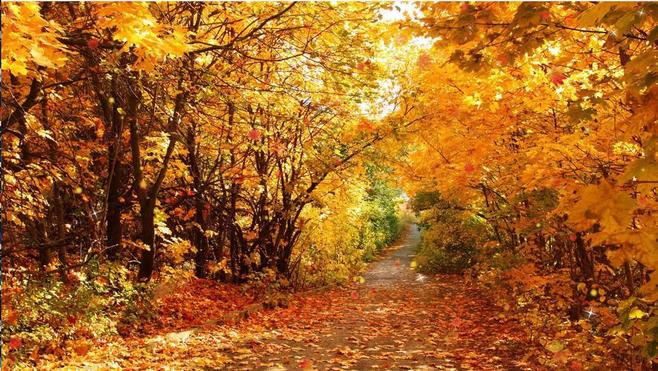 1、林间小道之中,金黄的落叶散了一地,踩着一路秋叶,我因为不明的诗意感动着,甚至有一份这个年纪的女孩子渴望奇遇的幻想。