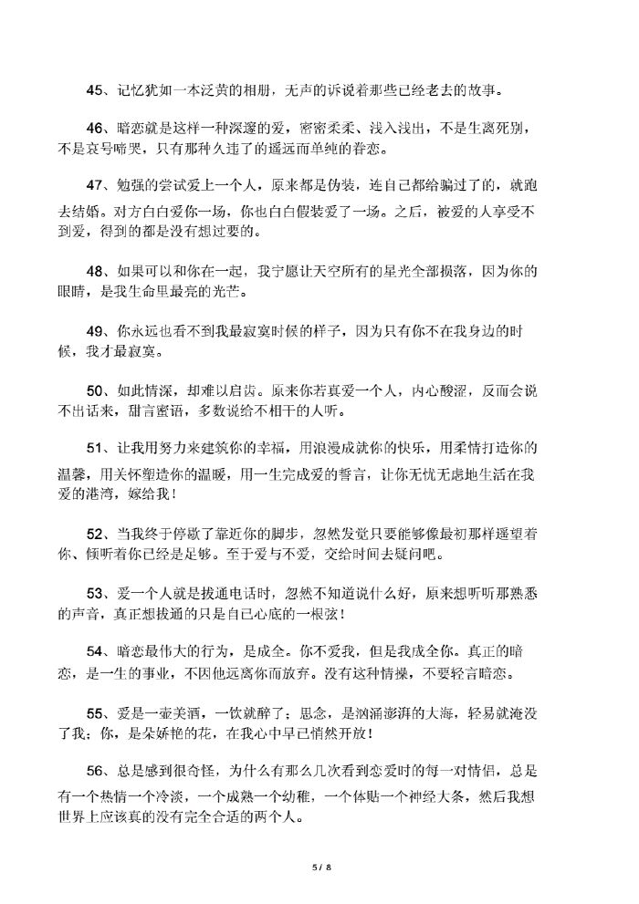 暗恋太累了,为了一个喜欢的人默默的付出,哪怕没有回报,知道她爱的是别人,可是还是为她付出2缺憾是感情最有余味的一种结局3就当我是首偶尔飘过你耳畔的诗,不贯穿你的生命,却给你一生祝福就当我是场。