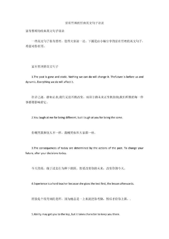 篇一简短有哲理英语句子摘抄大全1all of life is an act of letting go, but what hurts the most is not taking a moment to say goodbye人生也许就是不断地放下,然而令人痛心的是,我都没能好好地与。